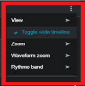 Defining the Wav form zoom If you wish to display the Wav form. The recommended zoom is x5. | Display>Display preferences>Timeline>Wavform Zoom>x5 OR using the three dots at the top right of the rhythmo space >WavformZoom>x5 |